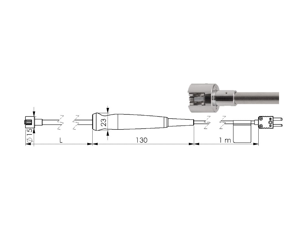 -E1.5 se zapichovacím snímačem GF 1TK-E1.5, Ø 1,5 mm, se silikonovou rukojetí (krátkodobě až 250 °C, trvale 230 °C), 1 m silikonový kabel (až 200 °C)